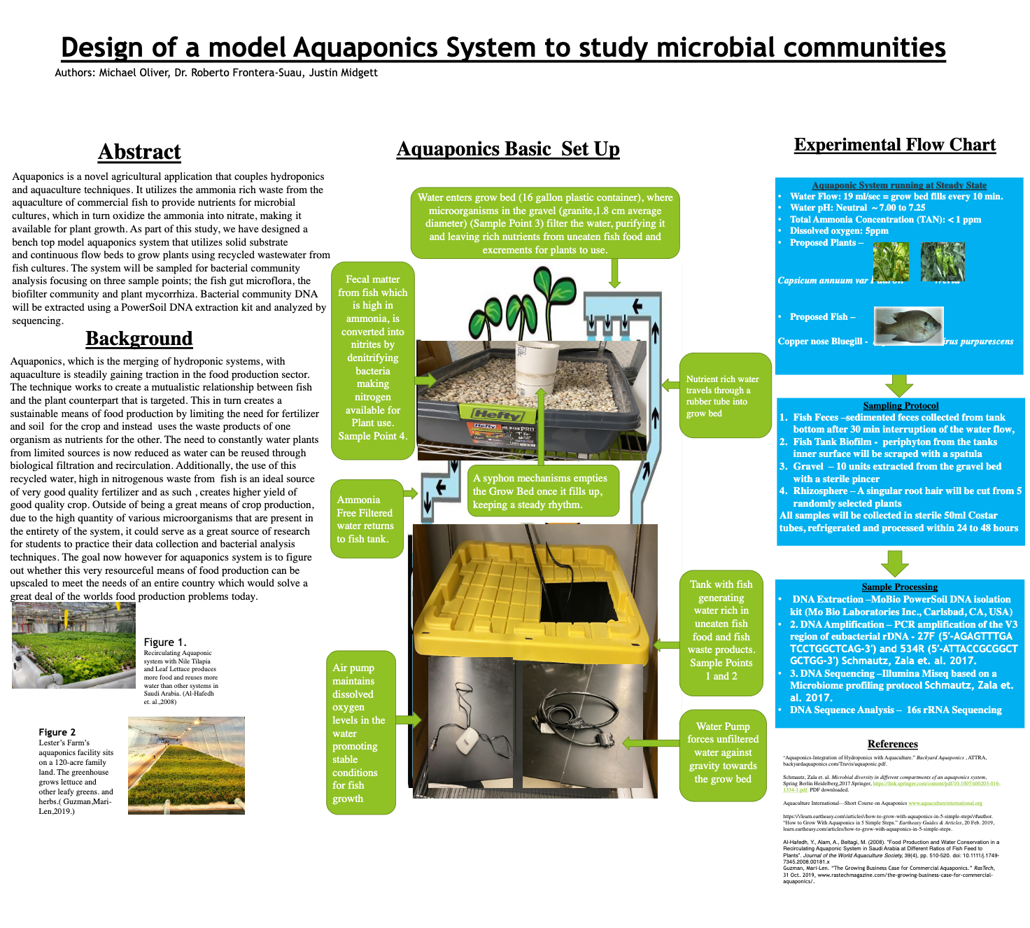 Aquaponics is a novel agricultural application that couples hydroponics and aquaculture techniques. It utilizes the ammonia rich waste from the aquaculture of commercial fish to provide nutrients for microbial cultures, which in turn oxidize the ammonia into nitrate, making it available for plant growth. As part of this study, we have designed a bench top model aquaponics system that utilizes solid substrate and continuous flow beds to grow plants using recycled wastewater from fish cultures. The system will be sampled for bacterial community analysis focusing on three sample points; the fish gut microflora, the biofilter community and plant mycorrhiza. Bacterial community DNA will be extracted using a PowerSoil DNA extraction kit and analyzed by sequencing.