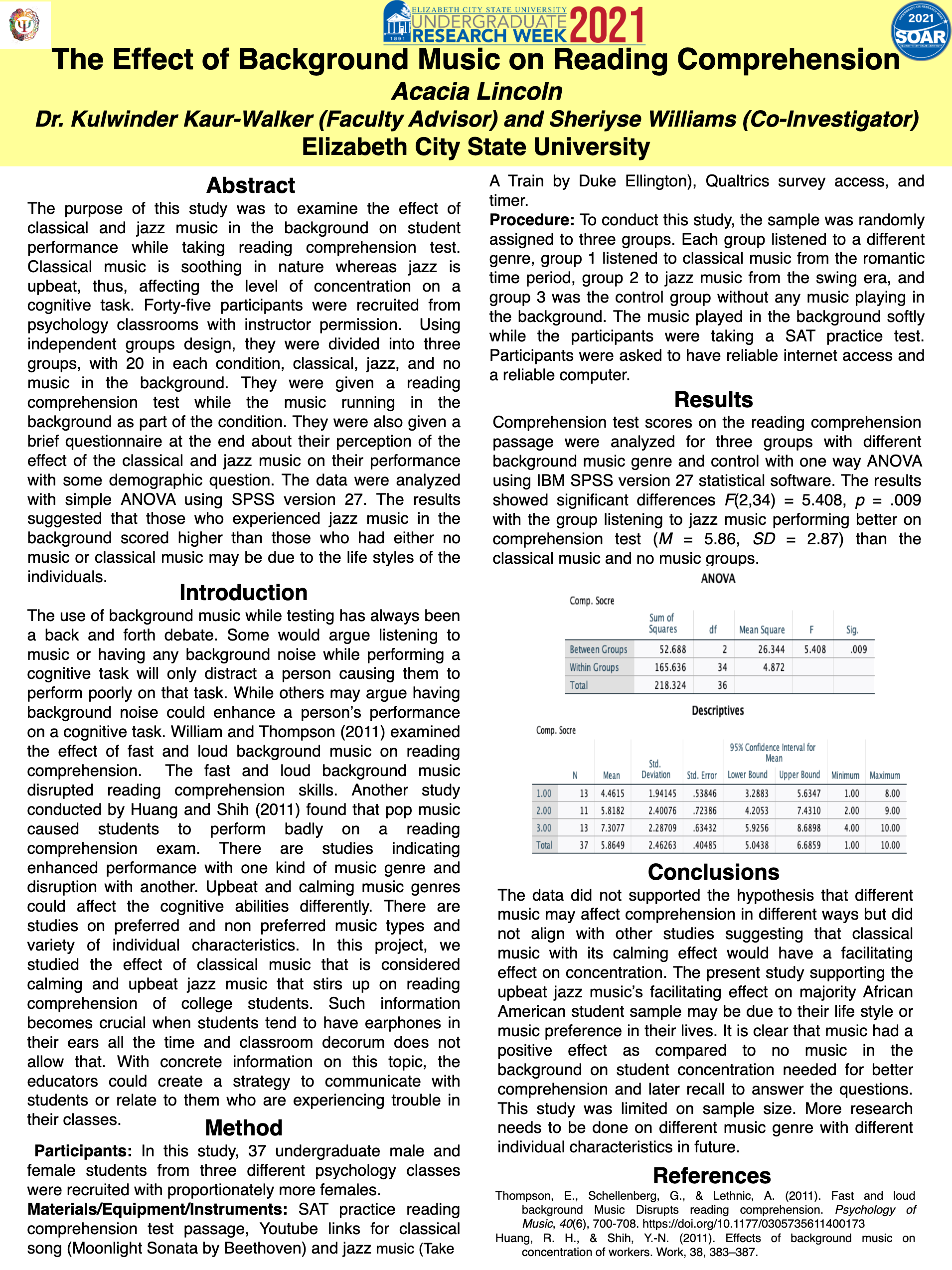 The purpose of this study was to examine the effect of classical and jazz music in the background on student performance while taking reading comprehension test. Classical music is soothing in nature whereas jazz is upbeat, thus, affecting the level of concentration on a cognitive task. Forty-five participants were recruited from psychology classrooms with instructor permission. Using independent groups design, they were divided into three groups, with 20 in each condition, classical, jazz, and no music in the background. They were given a reading comprehension test while the music running in the background as part of the condition. They were also given a brief questionnaire at the end about their perception of the effect of the classical and jazz music on their performance with some demographic question. The data were analyzed with simple ANOVA using SPSS version 27. The results suggested that those who experienced classical music in the background scored higher than those who had either no music or jazz.
